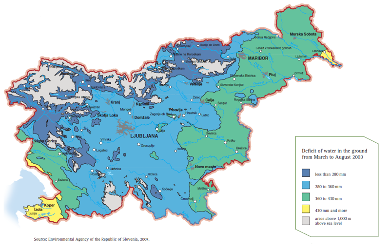 Since 1992, a total of seven summer droughts have hit agriculture. The drought accounted for 80 % of the total damage incurred from natural disasters in 2003. At least 15 % of the country’s surface area is threatened by a lack of water in the soil in summer months, most of all the Primorska region and northeast Slovenia. In observing climate change there has been a noticeable shift towards a serious lack of water in the interior of the country, too.